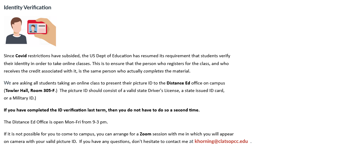 Remember to login to your class and start participating right away. Instructors will be taking student attendance the first week and the registrar’s office will be doing an administrative drop of students who have not checked in with the instructor and/or completed any assignments by Thursday of the first week of class.